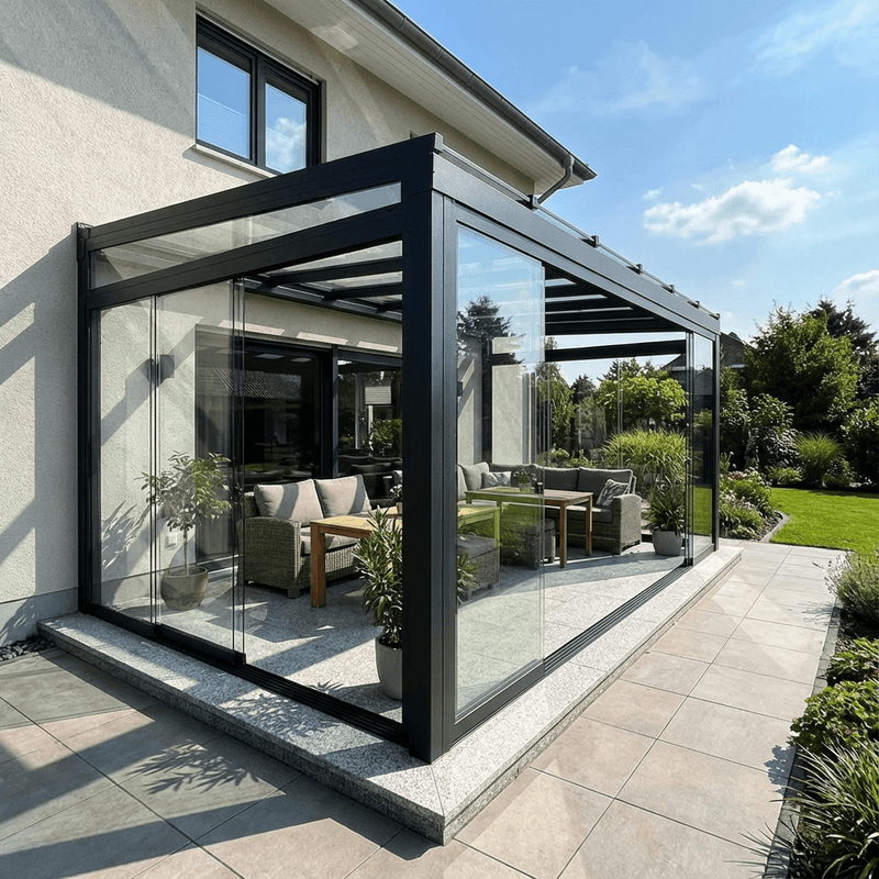 Qualität ohne Kompromisse: Erweitern Sie Ihre vorhandene Terrasse oder Ihren Wintergarten dank unserer hochwertigen Glasschiebewände in ein ganzjährig nutzbaren Wohnraum.