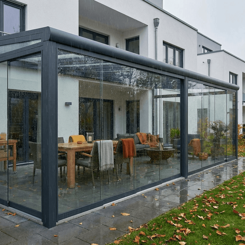 Geben Sie Wind und Kälte keine Chance: Verwandeln Sie Ihre Terrasse, Ihren Wintergarten oder Balkon mit unseren Glasschiebewänden in einen ganzjährig geschützten Wohlfühlort.