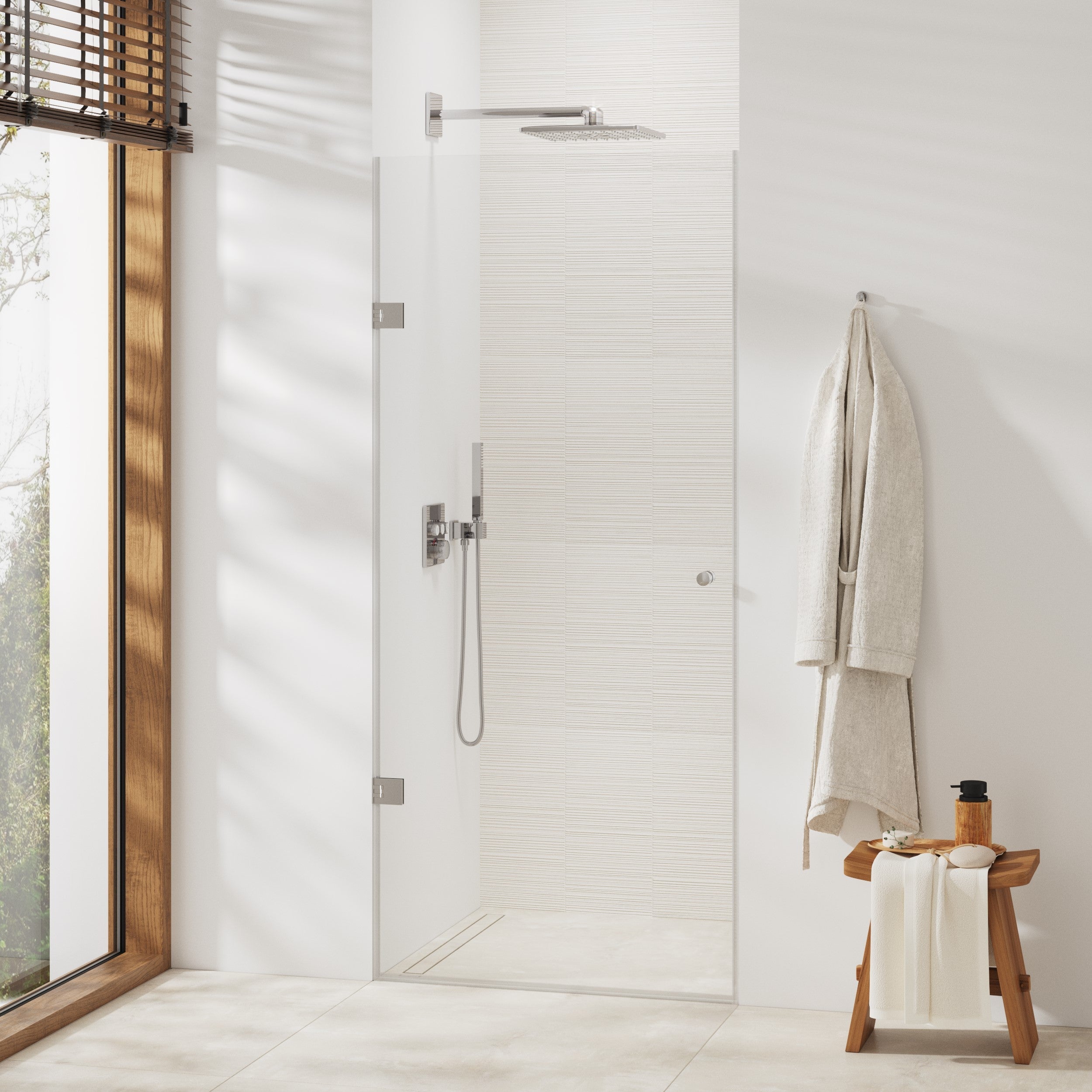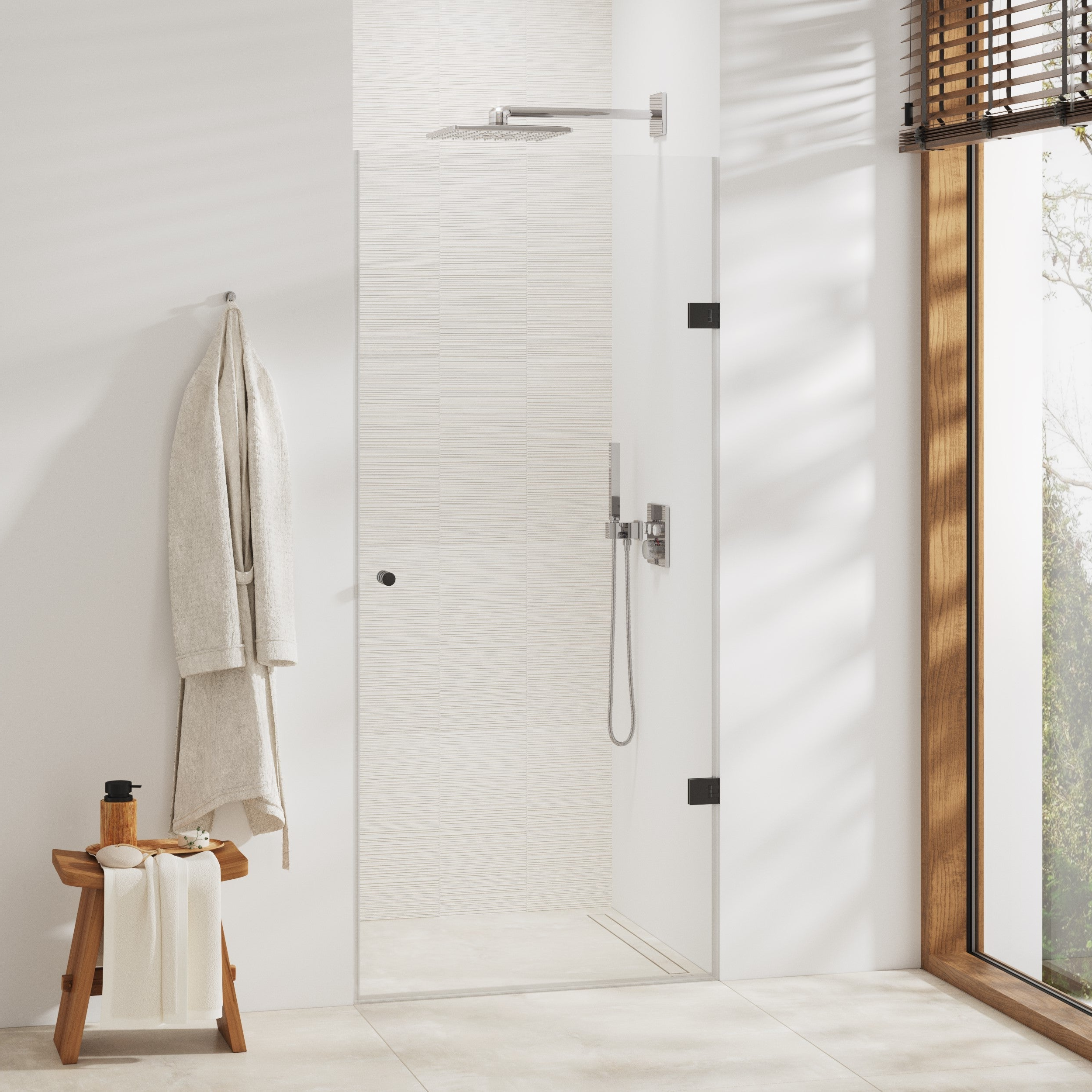 Die flexible Maßanfertigung ermöglicht eine perfekte Integration in Ihr Badezimmer. Mit einer variablen Breite von 700-900mm und einer komfortablen Höhe von 2000mm bietet die Duschtür großzügigen Einstiegskomfort. Die Montage des Türanschlags ist wahlweise rechts oder links möglich, wodurch sich die Dusche optimal in jede Raumsituation einfügt – ob als Nischenlösung oder kombiniert mit einer Seitenwand.