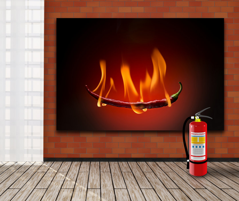 Heiß, heißer am heißesten, die perfekte Chilischote brennt schon für Sie mit Verbrennunsgefahr beim Aufhängen. Querformat in einer angenehmen 100 x 75 cm Maße, perfekt für jede Wand.