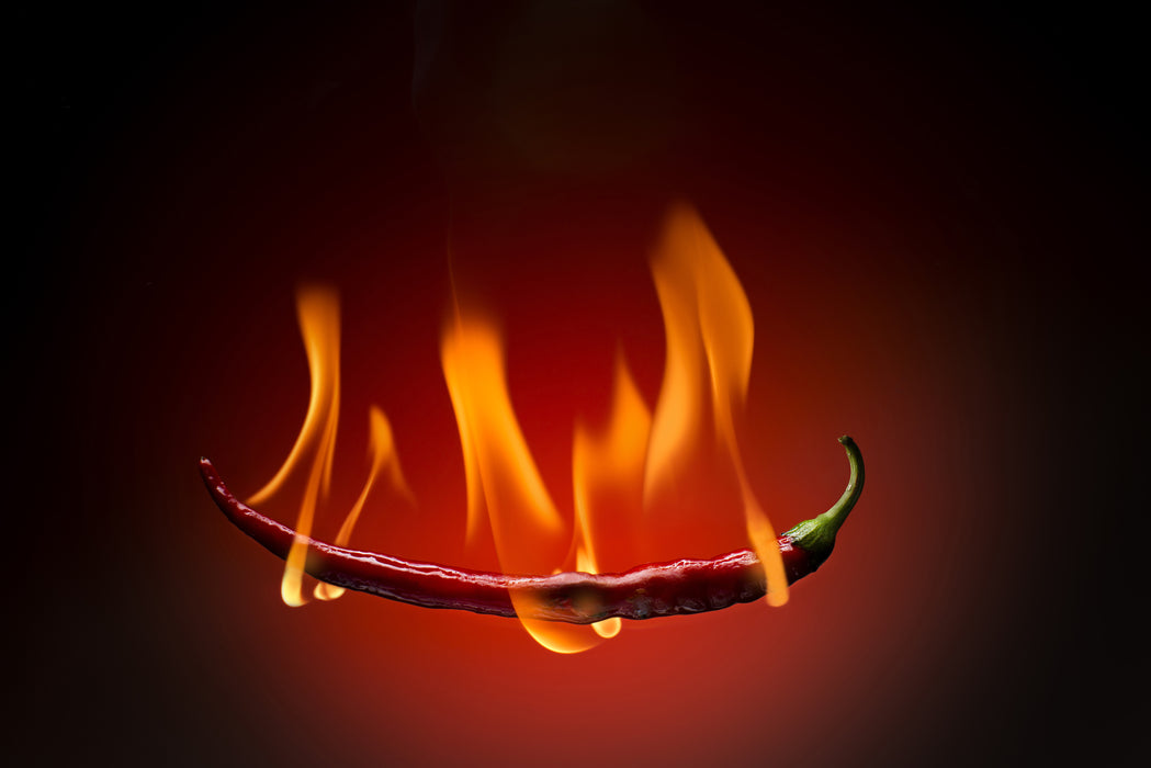 Heiß, heißer am heißesten, die perfekte Chilischote brennt schon für Sie mit Verbrennunsgefahr beim Aufhängen. Querformat in einer angenehmen 120 x 80 cm Maße, perfekt für jede Wand.