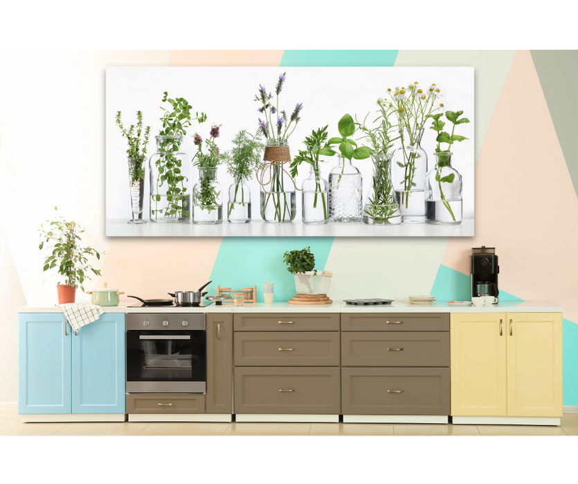 Glasbild "Kräuter und Blumen" aus 6mm ESG Sicherheitsglas mit Küchen Motiv.