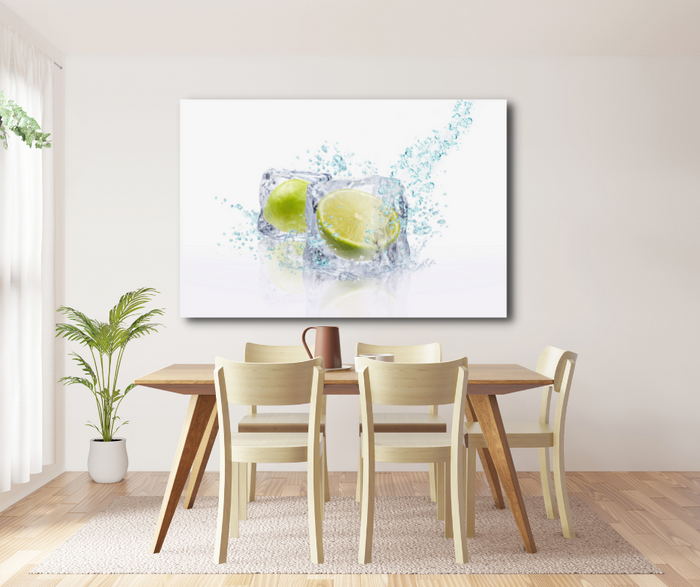 Iced Out Limetten - Limetten in Eiswürfeln gefroren - als eiskalte Erfrischung für Ihr Zuhause. Querformat in einer angenehmen 90 x 60 cm Maße, perfekt für jede Wand.