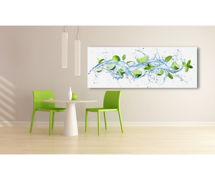 Die wichtigsten Zutaten für einen Mojito sind eine Limette und Minze, und natürlich Rum, für einen abgerundeten Geschmack. Querformat in einer angenehmen 224 x 63 cm Maße, perfekt für jede Wand.