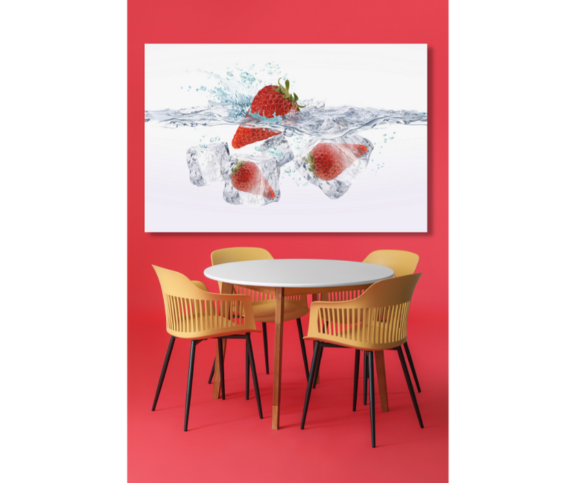 Frische Erdbeeren tauchen mit kühlen Eiswürfeln in Ihren Haushalt ein. Querformat in einer angenehmen 100 x 75 cm Maße, perfekt für jede Wand.