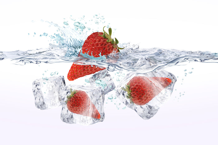 Frische Erdbeeren tauchen mit kühlen Eiswürfeln in Ihren Haushalt ein. Querformat in einer angenehmen 120 x 80 cm Maße, perfekt für jede Wand.