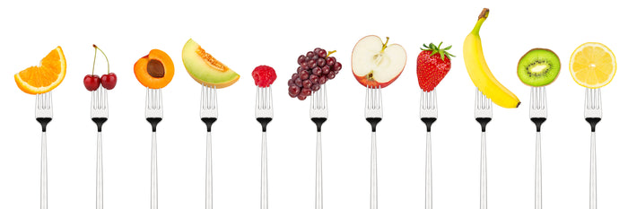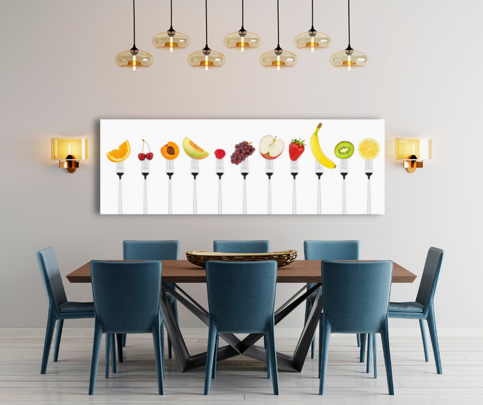 Küchenparty mit leckeren Früchten auf Gabeln, die man gerne abbeißen würde. Querformat in einer angenehmen 224 x 63 cm Maße, perfekt für jede Wand.