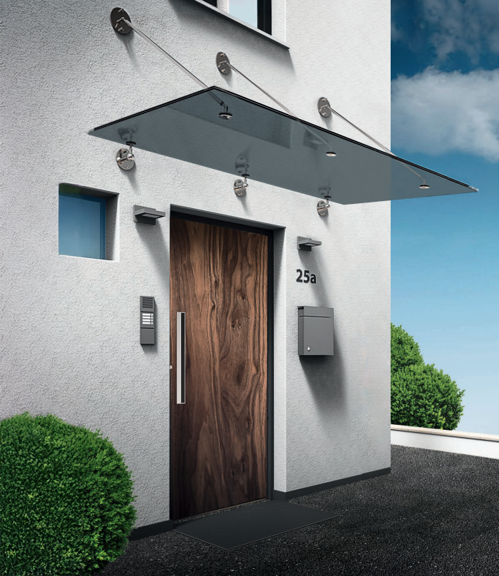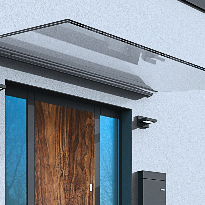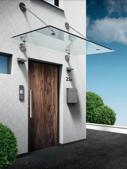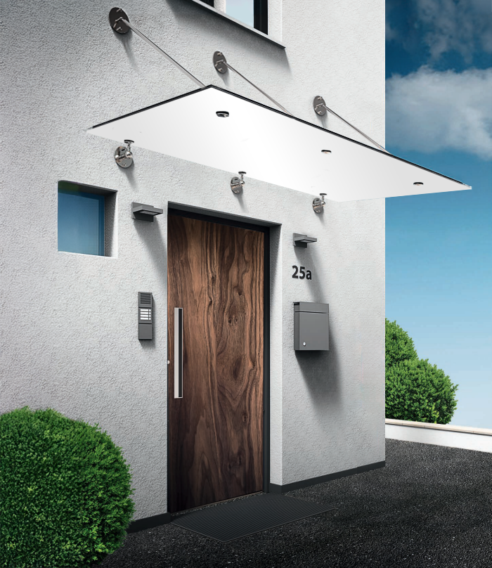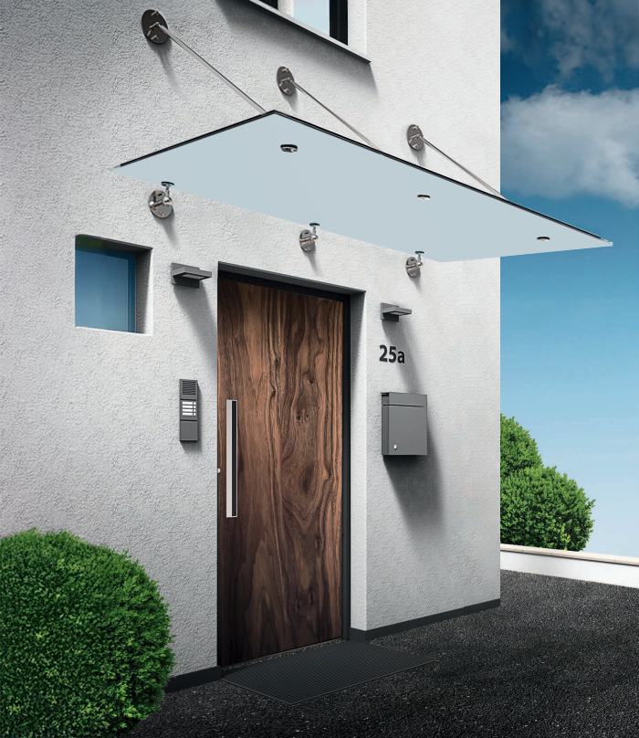 Unsere zeitlosen Vordächer mit Zugstangen sind mit unterschiedlichen Glasausführungen kombinierbar. Das moderne Design sorgt für eine harmonische Integration in die Gebäudearchitektur. Die Vordächer sind in Breiten von 1400mm bis 2800mm sowie Ausladungen von 750mm bis 950mm erhältlich und bietet damit flexiblen Gestaltungsspielraum für jeden Eingangsbereich.